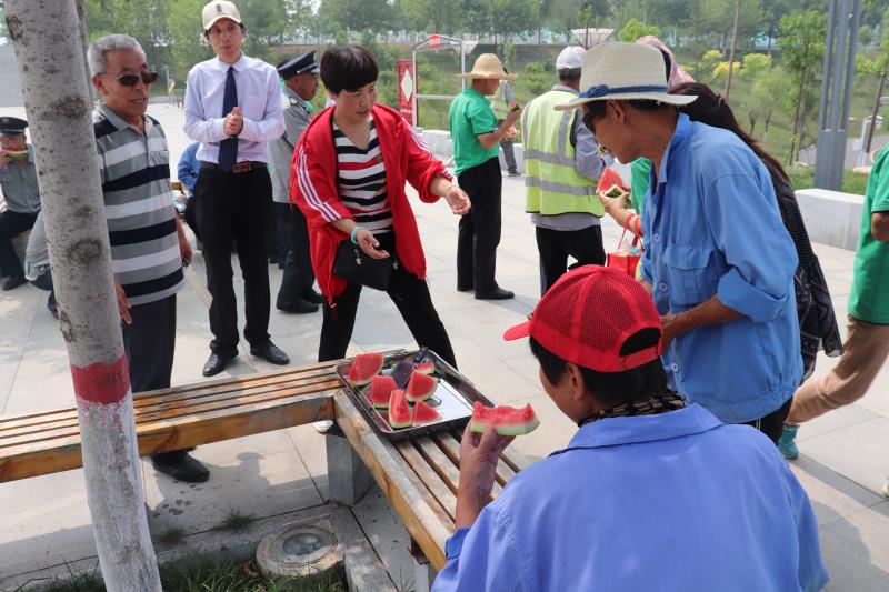 在公園的小廣場(chǎng),慰問(wèn)小組工作人員為員工切好西瓜,把西瓜、面包、白糖依次遞到員工手中,員工們親切的笑聲與慰問(wèn)人員的互動(dòng)形成了親情、溫情的交織,一片生動(dòng)和諧的場(chǎng)面。雖然是一個(gè)個(gè)面包,一塊塊西瓜、一袋袋白糖,卻使員工永遠記住了這美好時(shí)光。崔主席也親自為員工切起了西瓜,員工們品嘗著(zhù)西瓜和面包,感受著(zhù)領(lǐng)導的關(guān)懷,決心做好自己的本職工作,為晉城創(chuàng )建全國文明城市做出積極貢獻。
