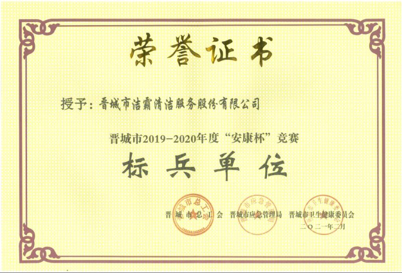 日前,在2019----2020年度全市“安康杯”競賽活動(dòng)中,晉城市潔霸清潔服務(wù)股份有限公司被晉城市總工會(huì )、晉城市應急管理局、晉城市衛生健康委員會(huì )聯(lián)合授予“安康杯”競賽“標兵單位”。