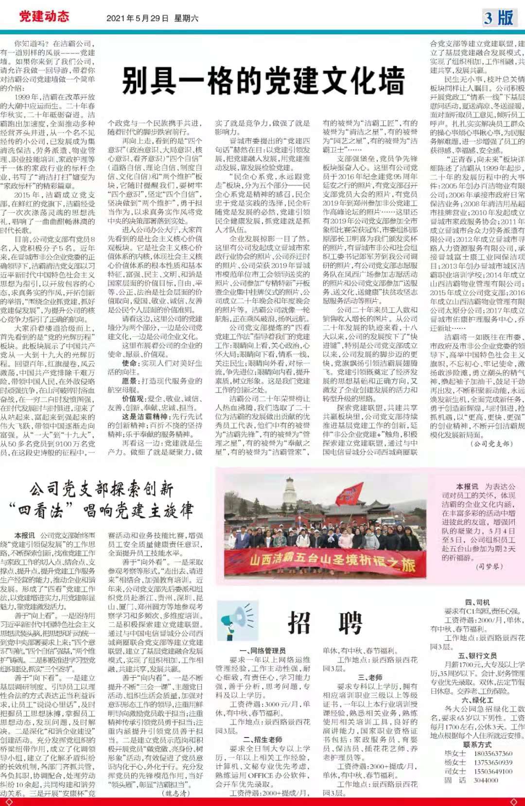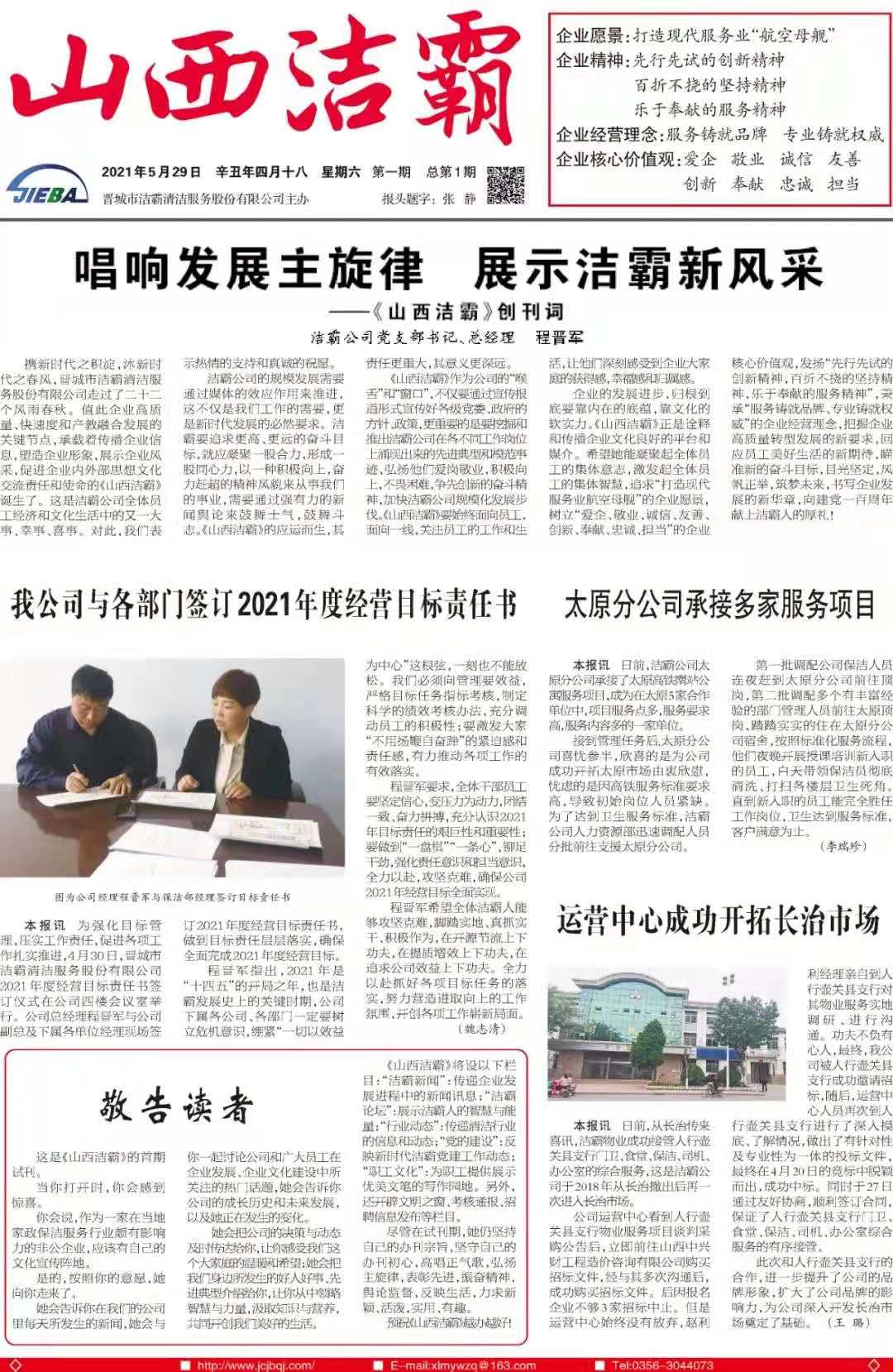 今天是2021年5月29日,經(jīng)過(guò)一個(gè)多月的緊張籌辦,《山西潔霸》報紙終于創(chuàng )刊啦!這是潔霸人的一件大喜事,也是潔霸人的驕傲!伴隨著(zhù)《山西潔霸》紙質(zhì)版的內部發(fā)行,電子版也同步與你見(jiàn)面了。希望你能通過(guò)這個(gè)宣傳窗口,更好地走近潔霸,了解潔霸,關(guān)注潔霸,支持潔霸。