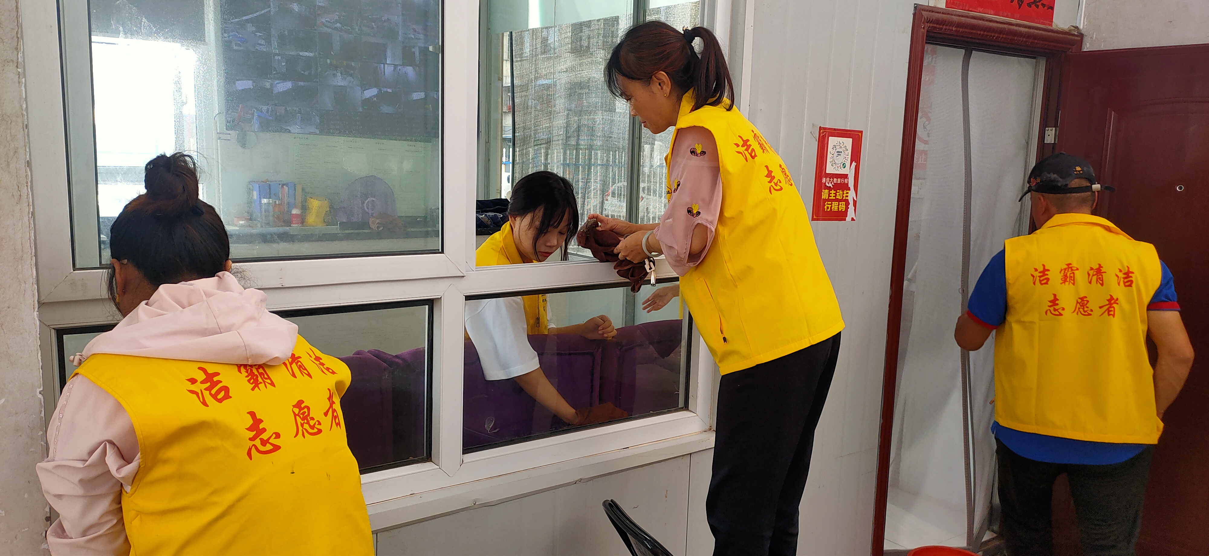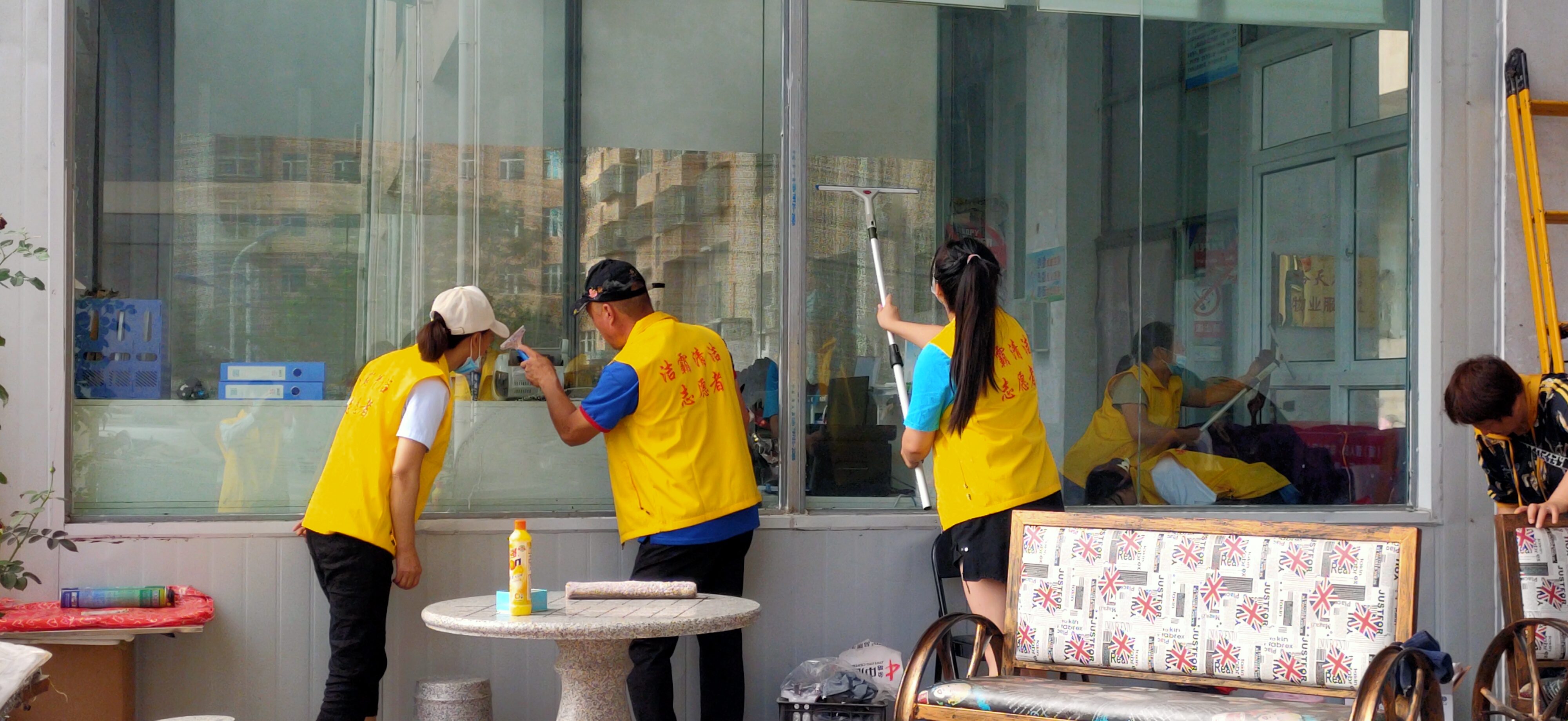 活動(dòng)現場(chǎng),志愿者身穿黃色馬甲,自帶玻璃擦、毛巾、笤帚、簸箕清潔工具,對小區物業(yè)服務(wù)處及小區環(huán)境進(jìn)行清潔打掃。他們有的清掃小區天臺上的垃圾;有的清理樓道門(mén)及公共設施上的牛皮癬;有的擦拭門(mén)衛的玻璃;有的清洗紗窗;有的清洗物業(yè)服務(wù)處的玻璃幕墻……志愿者個(gè)個(gè)干勁十足,不怕臟、不怕累,經(jīng)過(guò)一個(gè)多小時(shí)的團結協(xié)作,小區環(huán)境煥然一新。