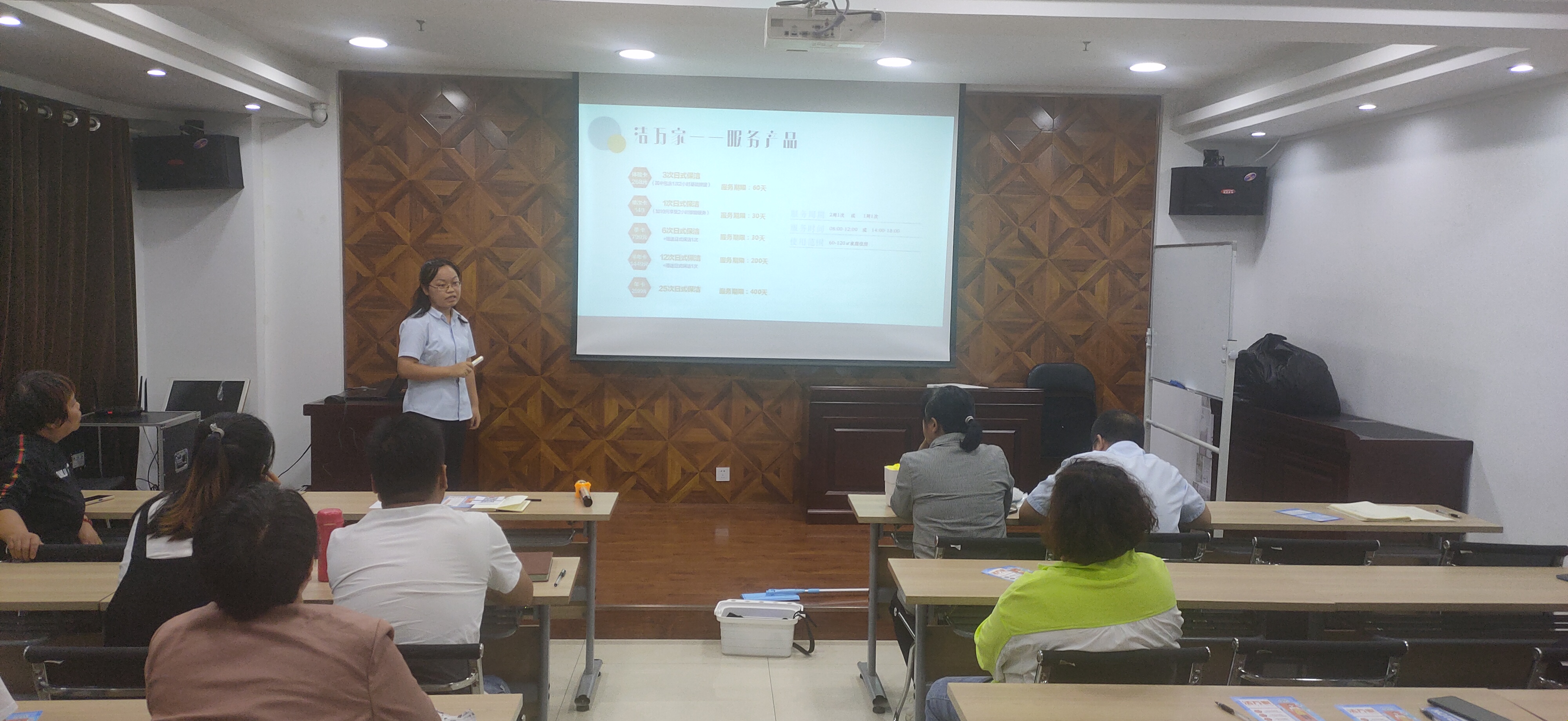 隨后由公司人力資源部負責人司夢(mèng)琴對“潔萬(wàn)家”日常保潔產(chǎn)品進(jìn)行了分類(lèi)介紹,此外還介紹了產(chǎn)品推廣獎勵方案和推廣話(huà)術(shù),對大家日后推廣過(guò)程中會(huì )遇到的客戶(hù)提出的各種問(wèn)題進(jìn)行了預設并一一詳細作答。