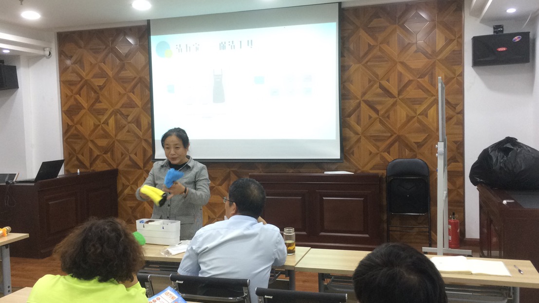 會(huì )議開(kāi)場(chǎng),從福建福州取經(jīng)回來(lái)的人力資源部呂利清用簡(jiǎn)短的一句話(huà)首先點(diǎn)出了“潔萬(wàn)家”產(chǎn)品的亮點(diǎn)——“1人1次4小時(shí)日常保潔服務(wù)”,接著(zhù)她從服務(wù)人員、服務(wù)時(shí)間、服務(wù)內容、保潔工具、保潔流程等方面介紹了“潔萬(wàn)家”日常保潔與年關(guān)保潔以及居家保潔的區別,并對服務(wù)內容所涵蓋的6大區域(臥室、衛生間、餐廳、客廳、廚房、陽(yáng)臺)以及專(zhuān)用8色保潔布的分類(lèi)使用進(jìn)行了詳細的介紹。