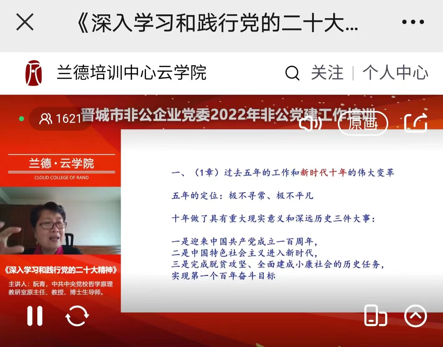 根據市非公企業(yè)黨委的安排,11月23日上午,公司黨支部組織全體黨員和入黨積極分子收看了市非公企業(yè)黨委2022年非公黨建工作培訓,聆聽(tīng)了中央黨校哲學(xué)原理教研室原主任、教授、博士生導師阮青主講的《深入學(xué)習和踐行黨的二十大精神》。