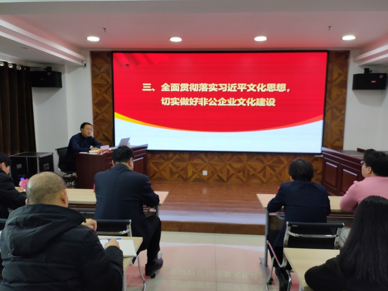 郝天順從習近平總書(shū)記對宣傳思想文化工作作出的重要指示談起,從“如何認識和理解習近平文化思想 ”“如何學(xué)習和貫徹習近平文化思想”“全面貫徹落實(shí)習近平文化思想,切實(shí)做好非公企業(yè)文化建設”三個(gè)方面進(jìn)行了深刻闡述,指出習近平文化思想既有文化理論觀(guān)點(diǎn)上的創(chuàng )新和突破,又有文化工作布局上的部署要求,明體達用、體用貫通,明確了新時(shí)代文化建設的路線(xiàn)圖和任務(wù)書(shū),在我國社會(huì )主義文化建設中展現出了強大偉力,為做好新時(shí)代新征程宣傳思想文化工作、擔負起新的文化使命提供了強大思想武器和科學(xué)行動(dòng)指南,并結合非公企業(yè)實(shí)際,要求要緊緊圍繞學(xué)習貫徹習近平文化思想,圍繞貫徹黨的二十大關(guān)于文化建設的戰略部署,強化黨建引領(lǐng)作用,帶動(dòng)企業(yè)文化發(fā)展,將文化建設作為企業(yè)戰略,不斷創(chuàng )新文化理念,將企業(yè)文化實(shí)體化、制度化,促進(jìn)企業(yè)文化升華,推動(dòng)各項工作落地見(jiàn)效。