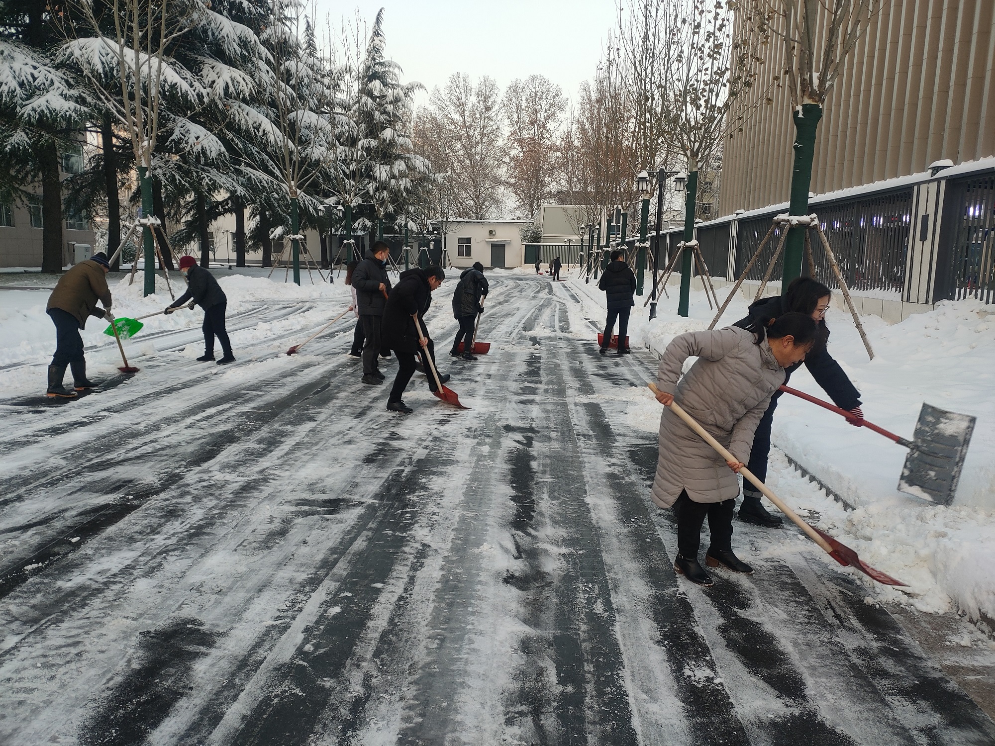 持續降雪,連續作業(yè)。16日晚,我市再次迎來(lái)降雪天氣。17日一大早,公司全體黨員和入黨積極分子又第一時(shí)間投入到市政府除冰雪的戰斗中,大家團結協(xié)作,不畏嚴寒,確保了上午九點(diǎn)以前市政府院內人員、車(chē)輛通行順暢。