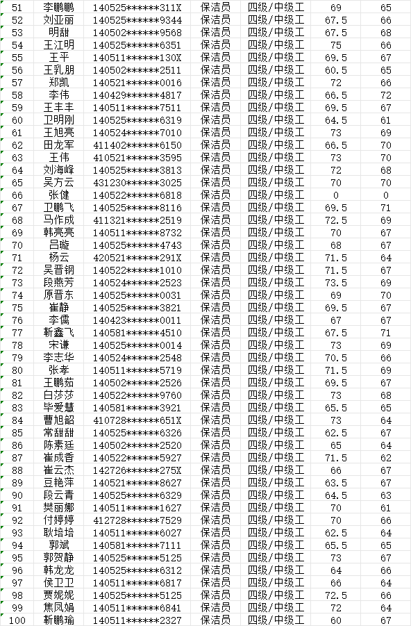 晉城市潔霸清潔服務(wù)股份有限公司職業(yè)技能等級認定中心現將2024年1月28日認定人員成績(jì)公示如下: