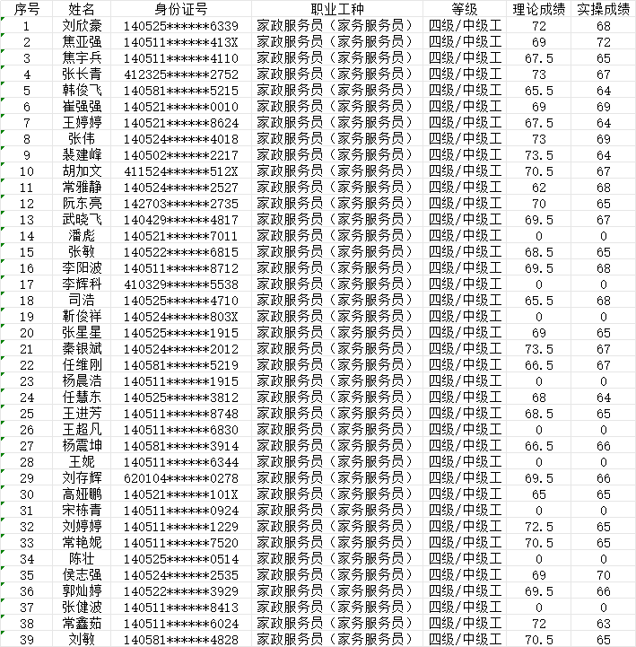 晉城市潔霸清潔服務(wù)股份有限公司職業(yè)技能等級認定中心現將2024年1月28日認定人員成績(jì)公示如下: