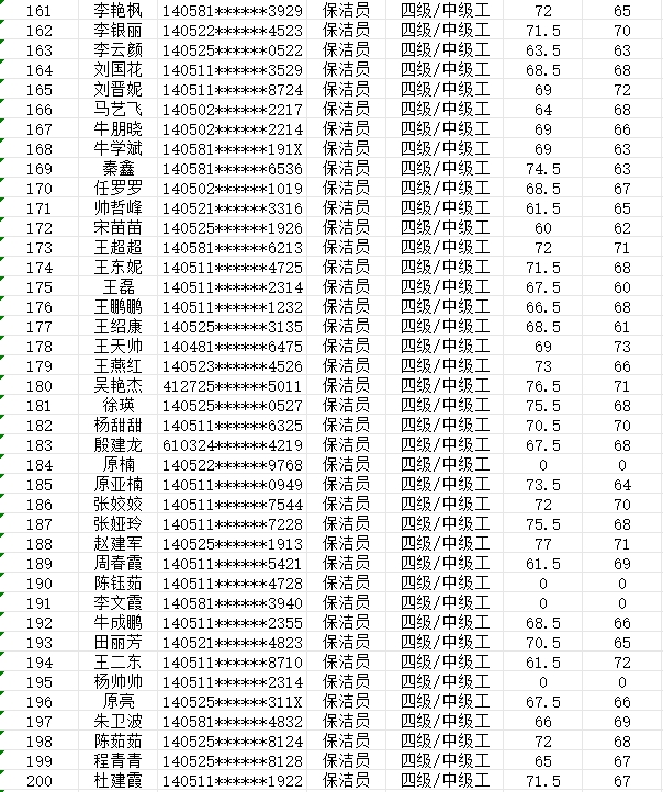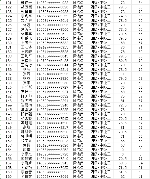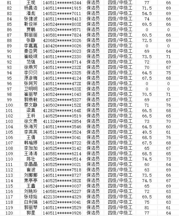 晉城市潔霸清潔服務(wù)股份有限公司職業(yè)技能等級認定中心現將2024年2月4日認定人員成績(jì)公示如下: