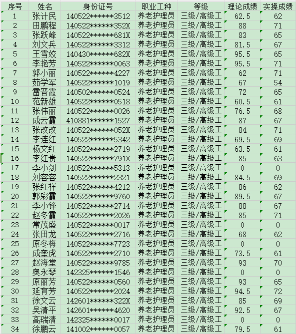 2024年5月20日下午第14批養老護理員高級認定人員成績(jì)公示