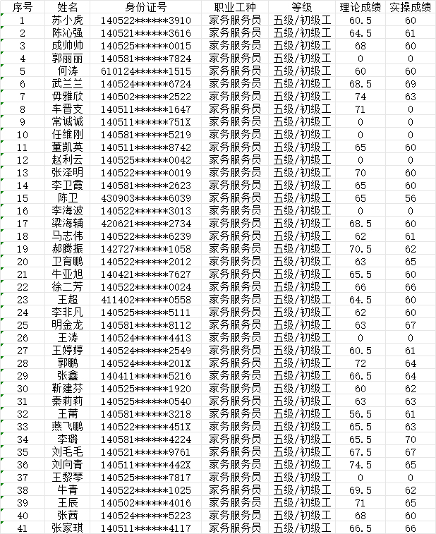 晉城市潔霸清潔服務(wù)股份有限公司職業(yè)技能等級認定中心現將2024年5月26日認定人員成績(jì)公示如下: