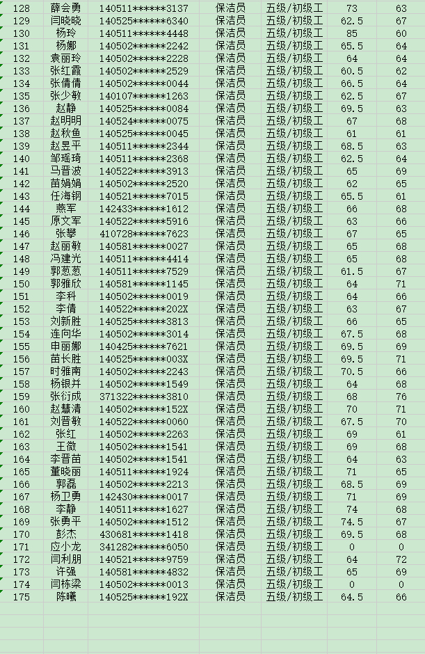 晉城市潔霸清潔服務(wù)股份有限公司職業(yè)技能等級認定中心現將2024年6月2日認定人員成績(jì)公示如下: