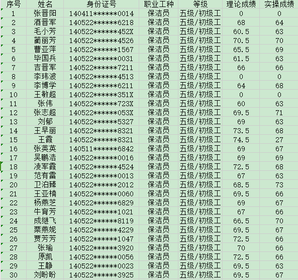 晉城市潔霸清潔服務(wù)股份有限公司職業(yè)技能等級認定中心現將2024年8月31日認定人員成績(jì)公示如下: