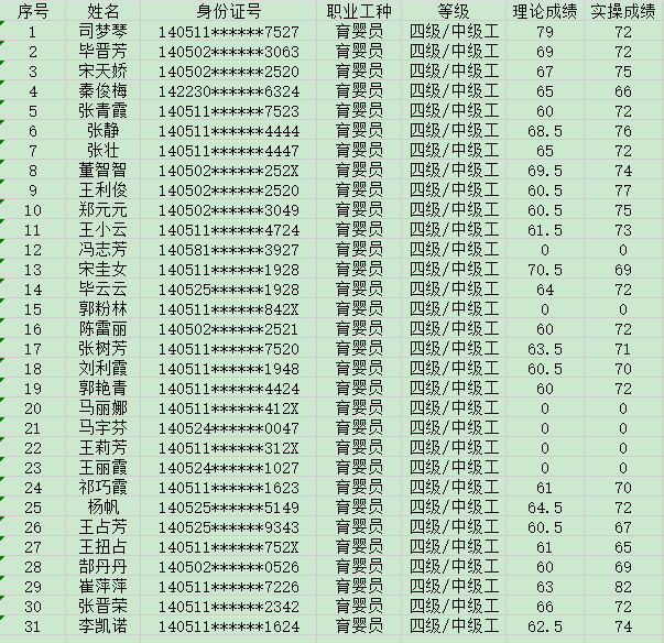 晉城市潔霸清潔服務(wù)股份有限公司職業(yè)技能等級認定中心現將2024年9月27日認定人員成績(jì)公示如下: