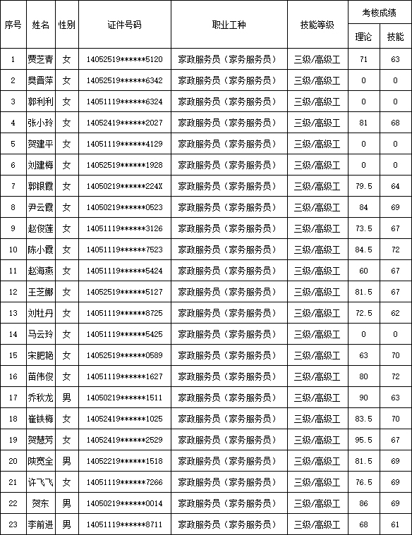 山西潔霸清潔服務(wù)集團股份有限公司職業(yè)技能等級認定中心2025年8月30日第1批家政服務(wù)員(家務(wù)服務(wù)員)高級認定人員成績(jì)公示