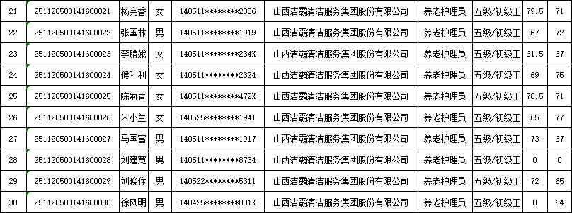 山西潔霸清潔服務(wù)集團股份有限公司職業(yè)技能等級認定中心現將2025年11月22日認定人員成績(jì)公示如下: