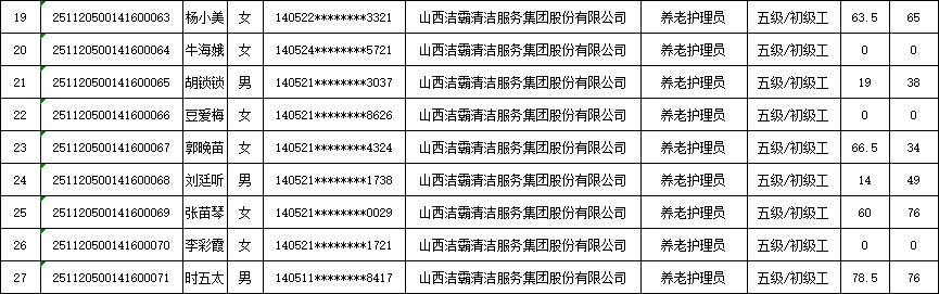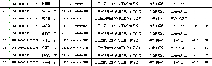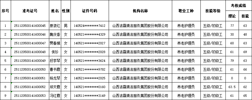 山西潔霸清潔服務(wù)集團股份有限公司職業(yè)技能等級認定中心現將2025年11月23日認定人員成績(jì)公示如下:
